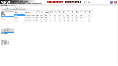 Sweep Coach is a complete system for capturing and analyzing curler sweeping performance. MPWTech first developed Sweep Coach in 2011, and provided systems for the Canadian Curling Association in 2012. Sweep Coach is a "smart" performace brush outfitted with precision sensors and custom electronics. The brush's embedded microcontroller system captures the athlete's sweeping performance and wirelessly transmits the data to a laptop for analysis and storage.