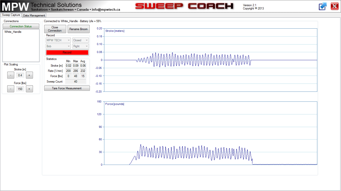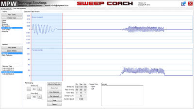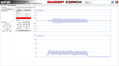 Sweep Coach is a complete system for capturing and analyzing curler sweeping performance. MPWTech first developed Sweep Coach in 2011, and provided systems for the Canadian Curling Association in 2012. Sweep Coach is a "smart" performace brush outfitted with precision sensors and custom electronics. The brush's embedded microcontroller system captures the athlete's sweeping performance and wirelessly transmits the data to a laptop for analysis and storage.